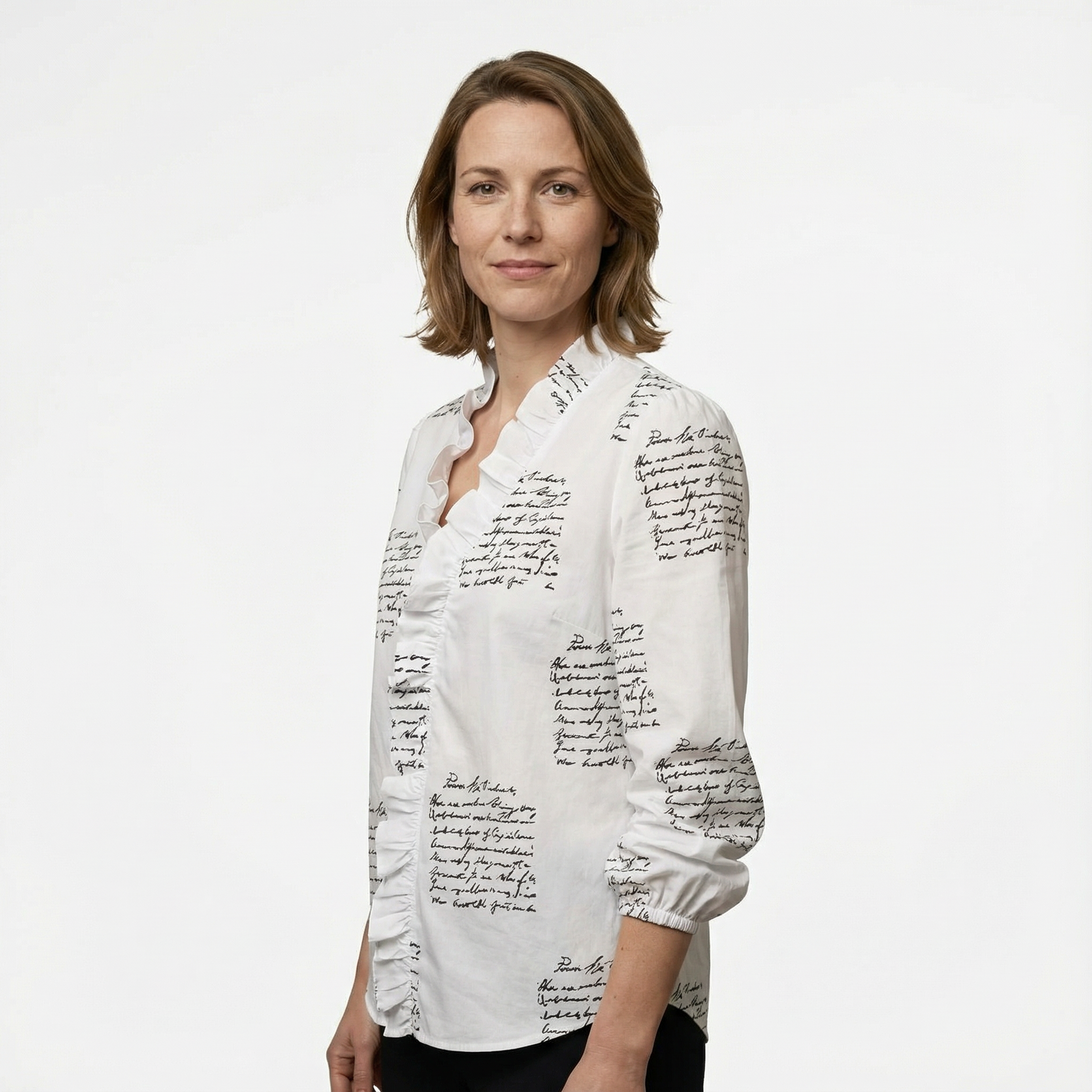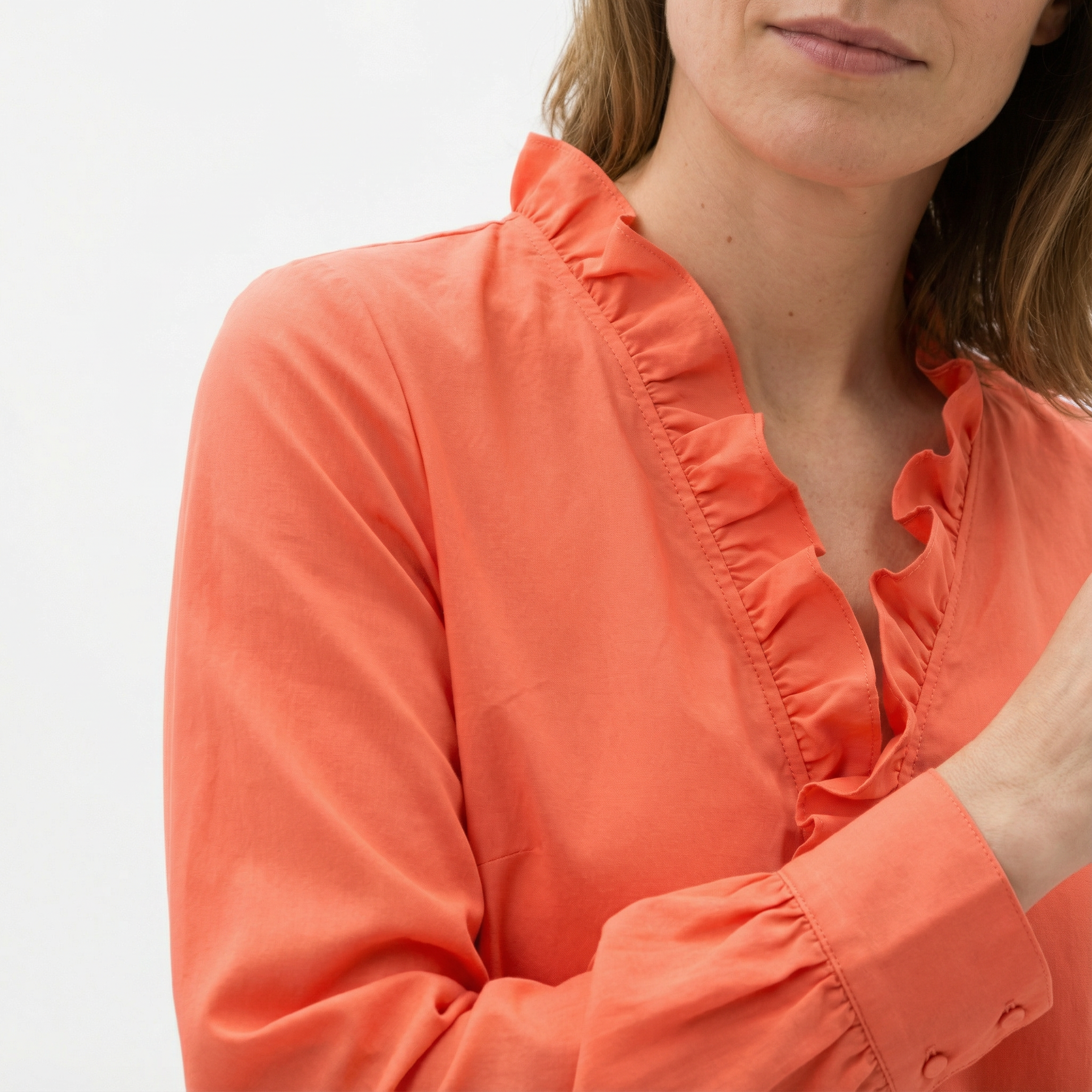 Diese Damenbluse vereint feminine Eleganz mit zeitgemäßem Chic. Der schmeichelnde V-Ausschnitt und die feinen Rüschen verleihen dem Design eine stilvolle Leichtigkeit, während das angenehme Material hohen Tragekomfort bietet. Ein vielseitiges Essential für Büro, Freizeit und elegante Anlässe.