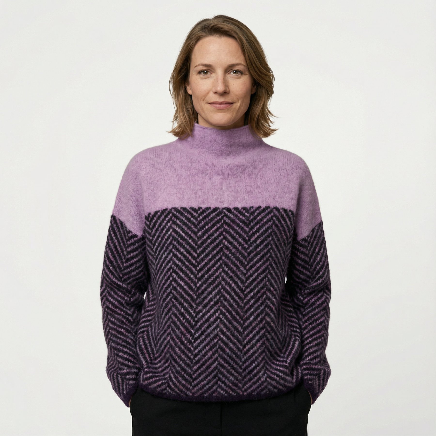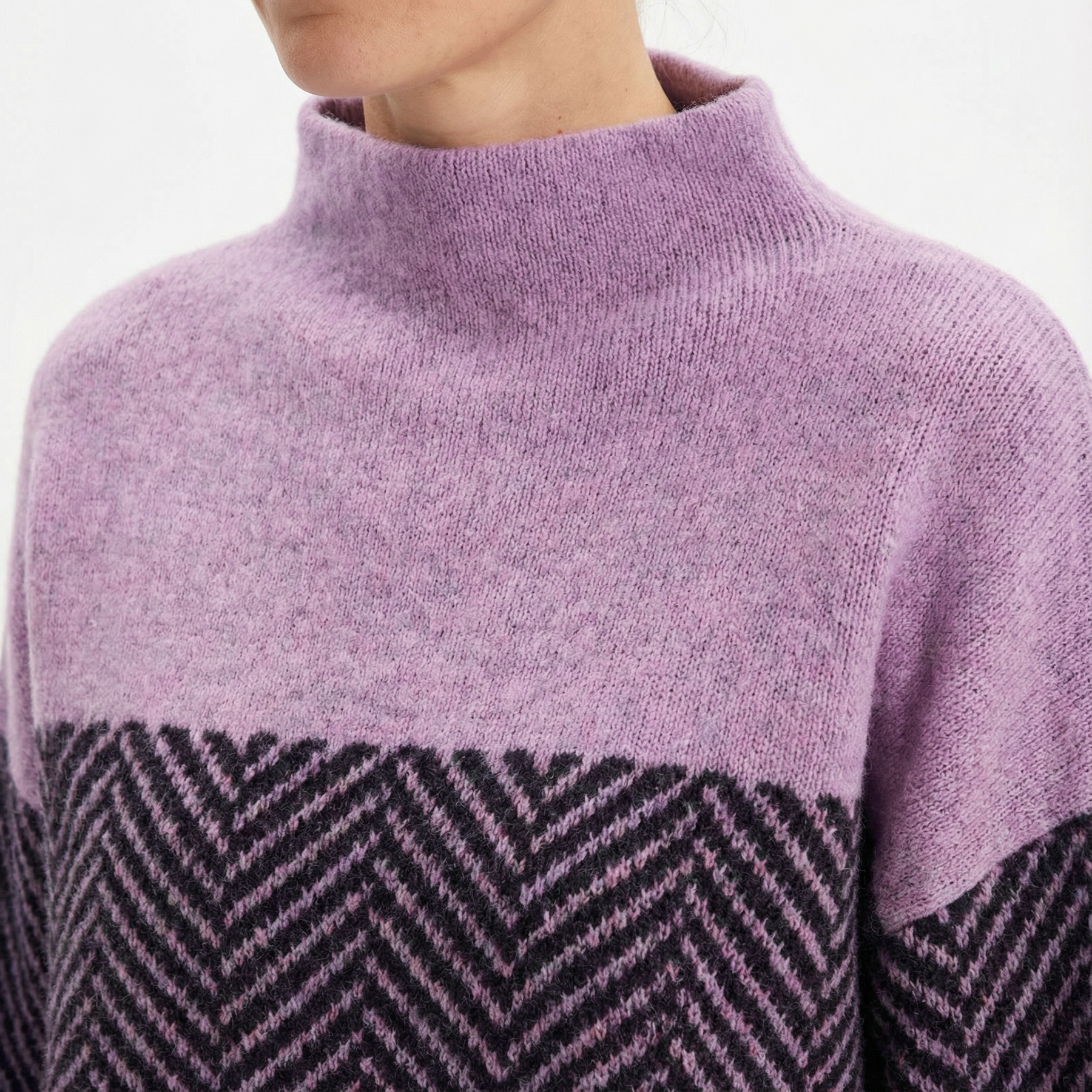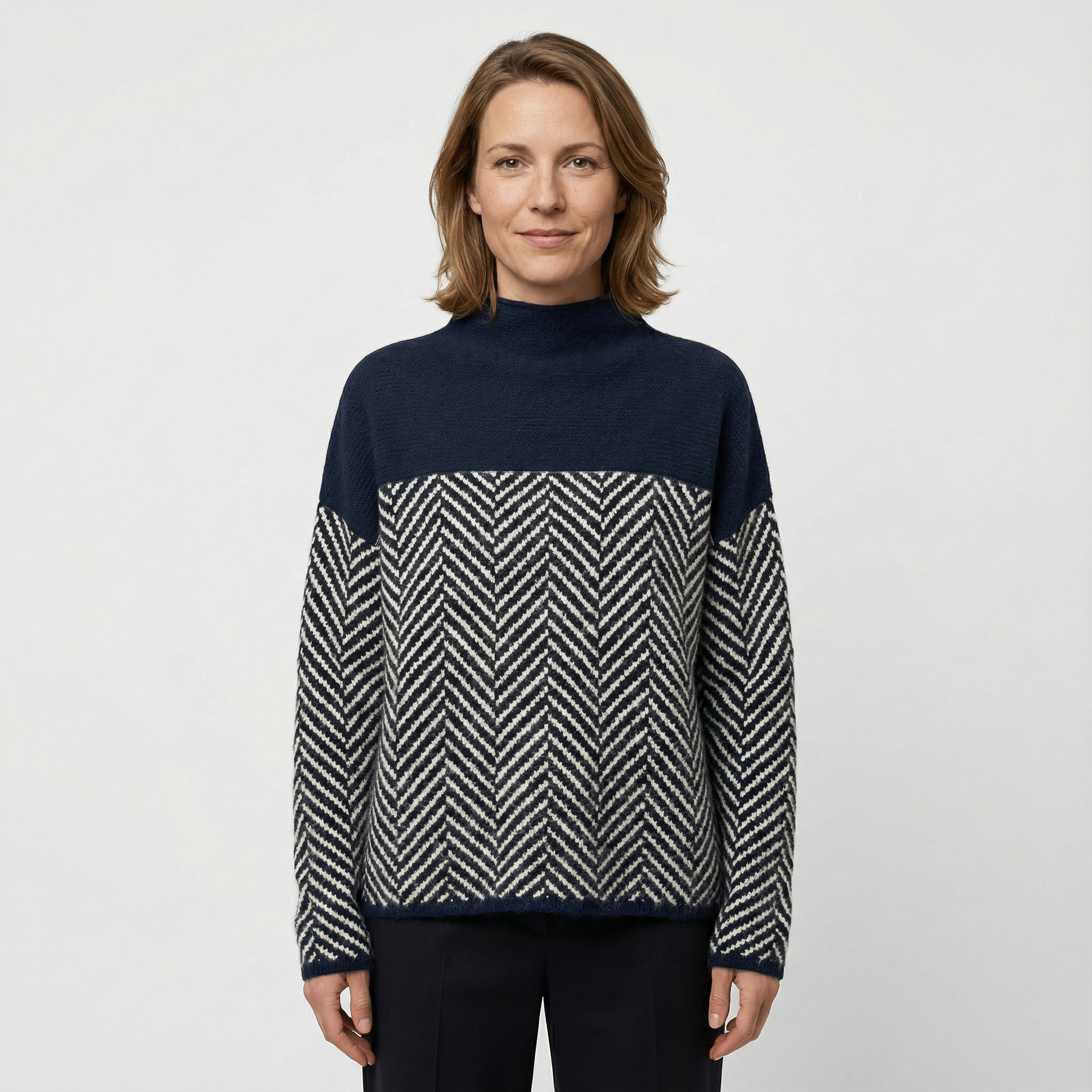 Dieser Damenpullover kombiniert angenehmen Tragekomfort mit einem klaren, modernen Design. Das weiche, strukturierte Strickmaterial und das zweifarbige Fischgrätmuster verleihen dem Look Tiefe, während der Stehkragen für eine saubere, elegante Linie sorgt. Ideal für entspannte Alltagslooks mit stilvollem Anspruch.