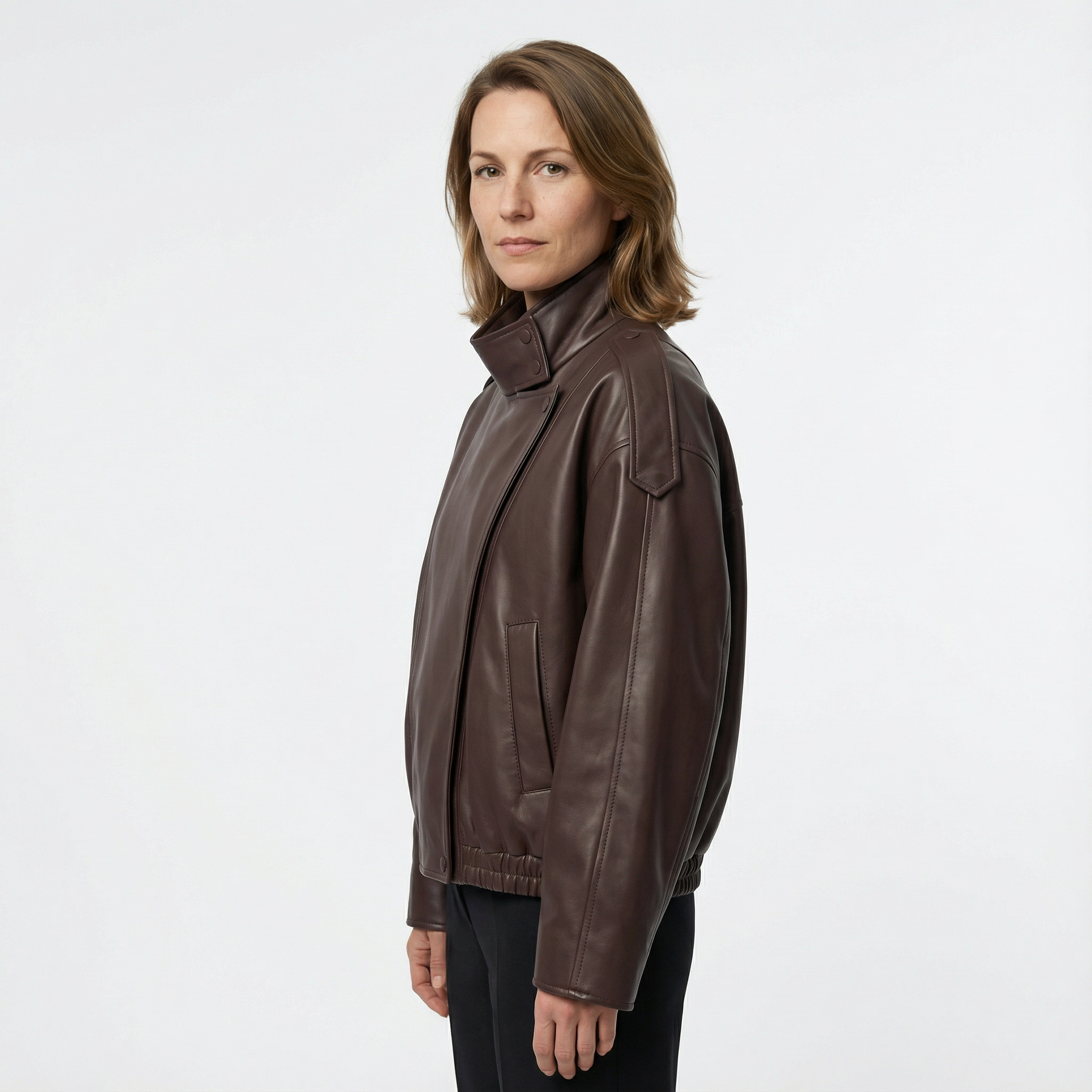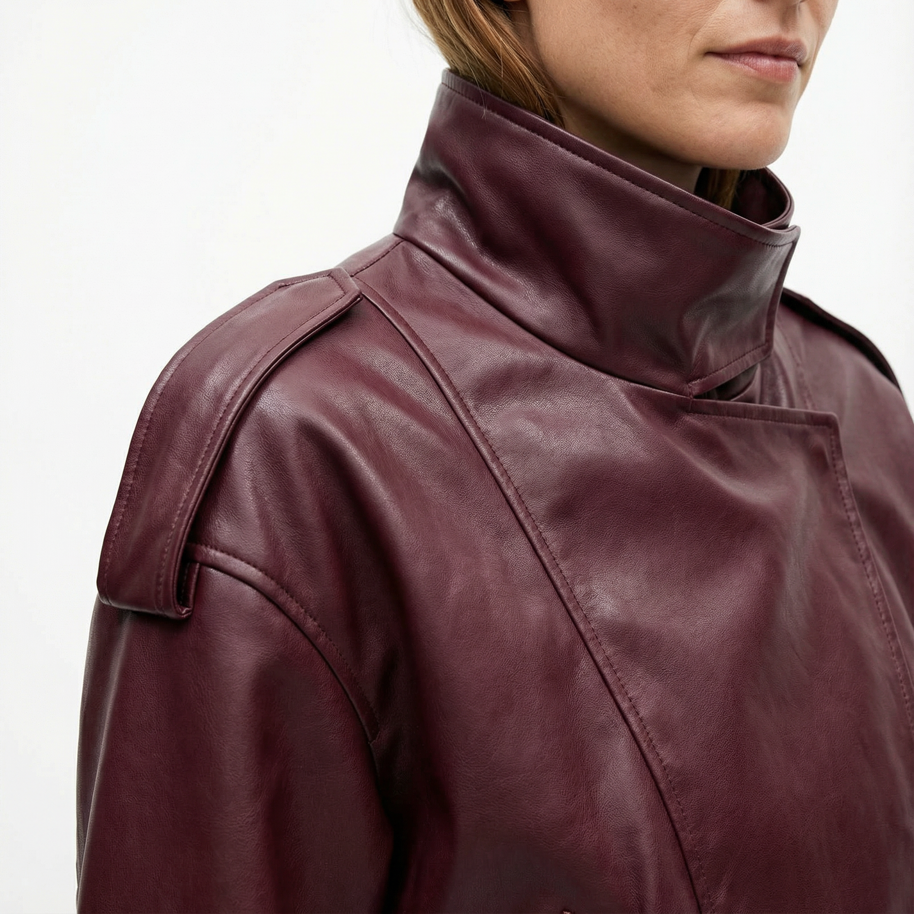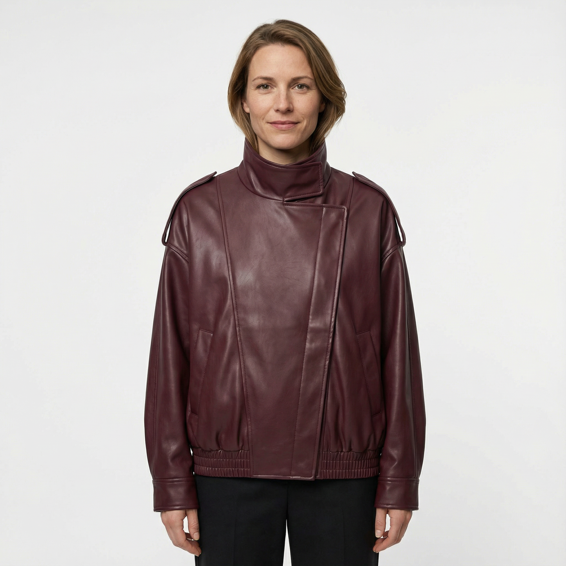 Diese Damenjacke aus schwarzem Kunstleder überzeugt durch eine klare, zeitgemäße Ausführung und eine großzügige Oversize-Passform. Das strukturierte Material verleiht der Jacke eine hochwertige Optik, während die langen Ärmel und der elastische Saum für eine ausgewogene, funktionale Silhouette sorgen. Ein modernes Oberteil mit ruhiger, markanter Präsenz.