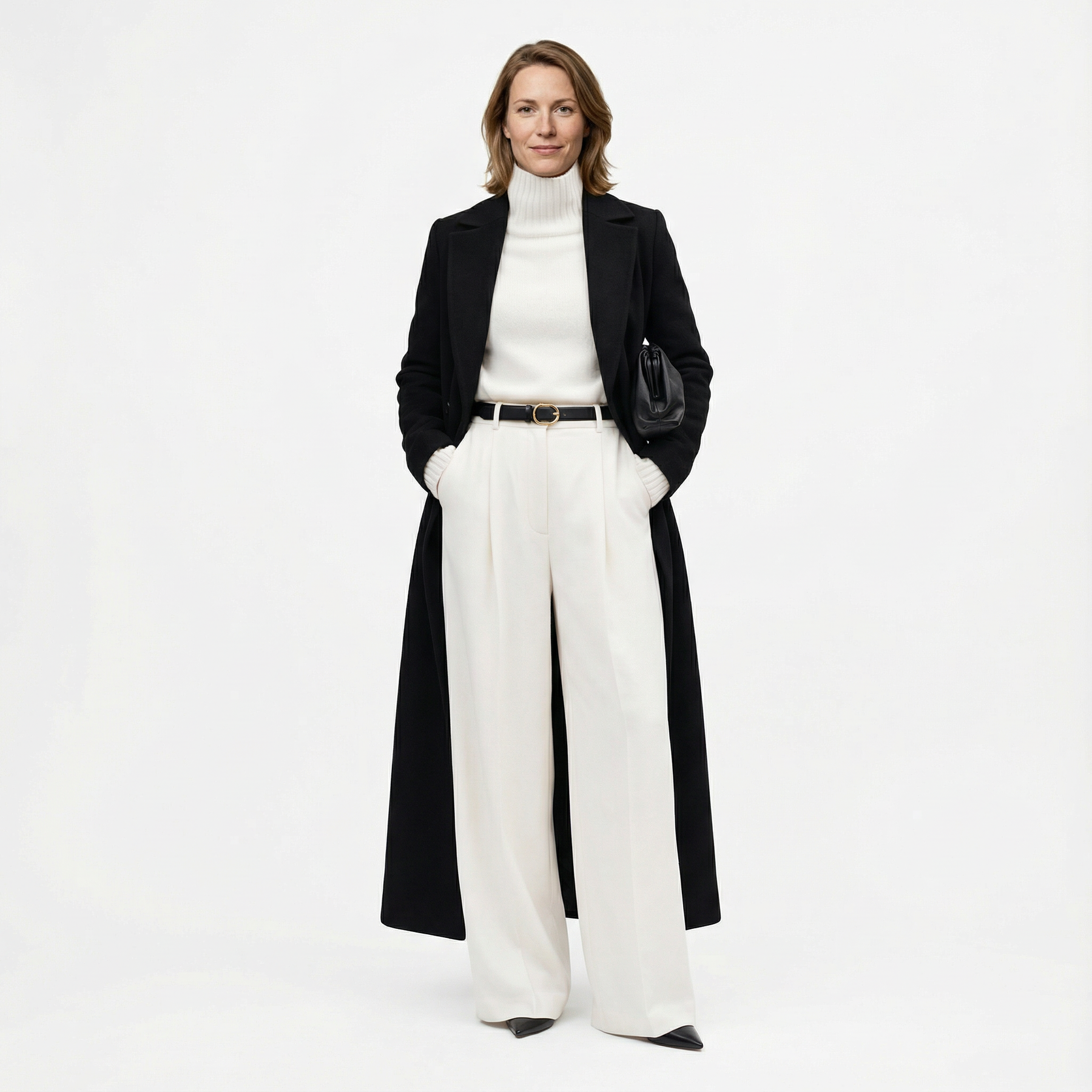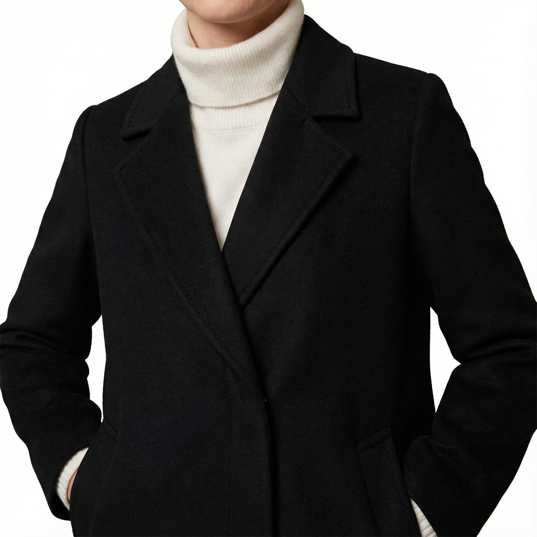 Dieser schwarze Maxi-Overcoat für Damen steht für mühelose Raffinesse und moderne Klarheit. Die lange, maßgeschneiderte Silhouette verleiht jedem Outfit eine elegante Ausstrahlung und eignet sich ideal für stilvolles Layering zu jeder Jahreszeit. Ein vielseitiges Essential, das Business-Looks ebenso veredelt wie elegante Abend-Outfits.