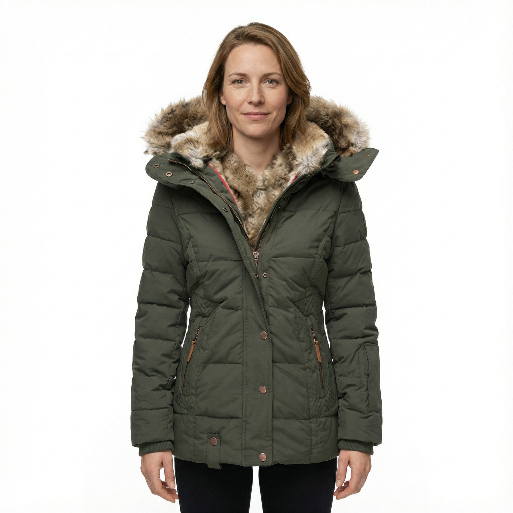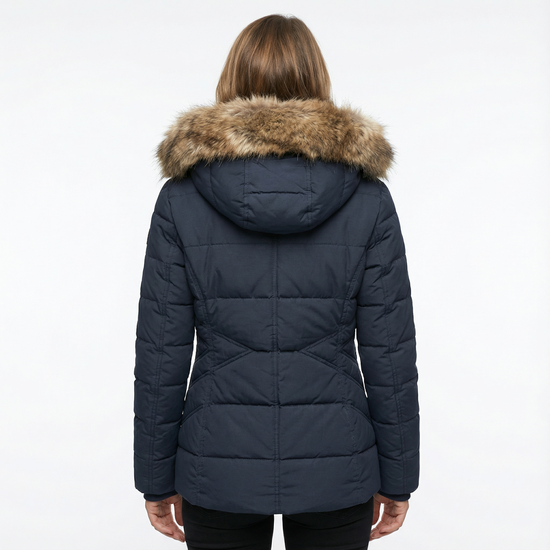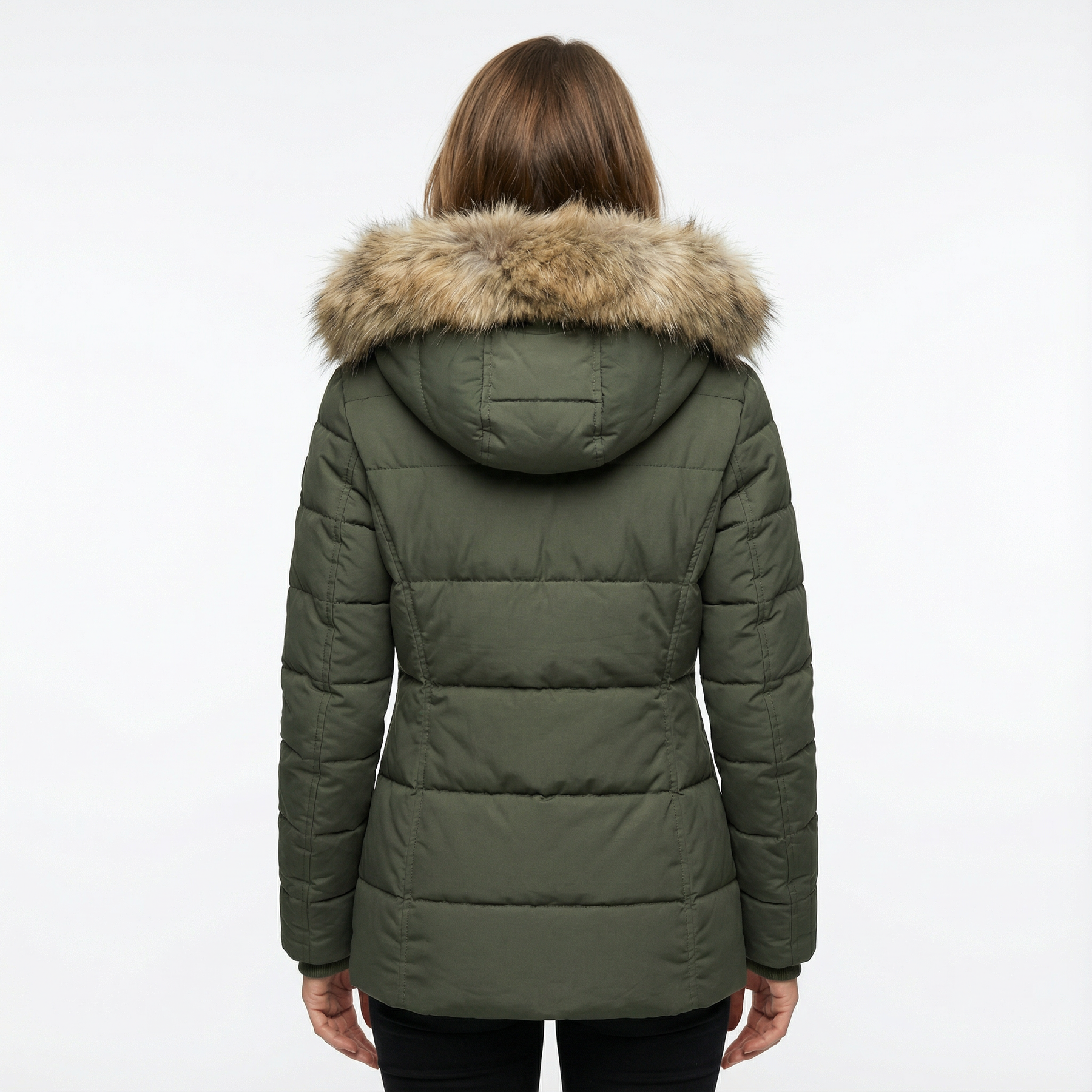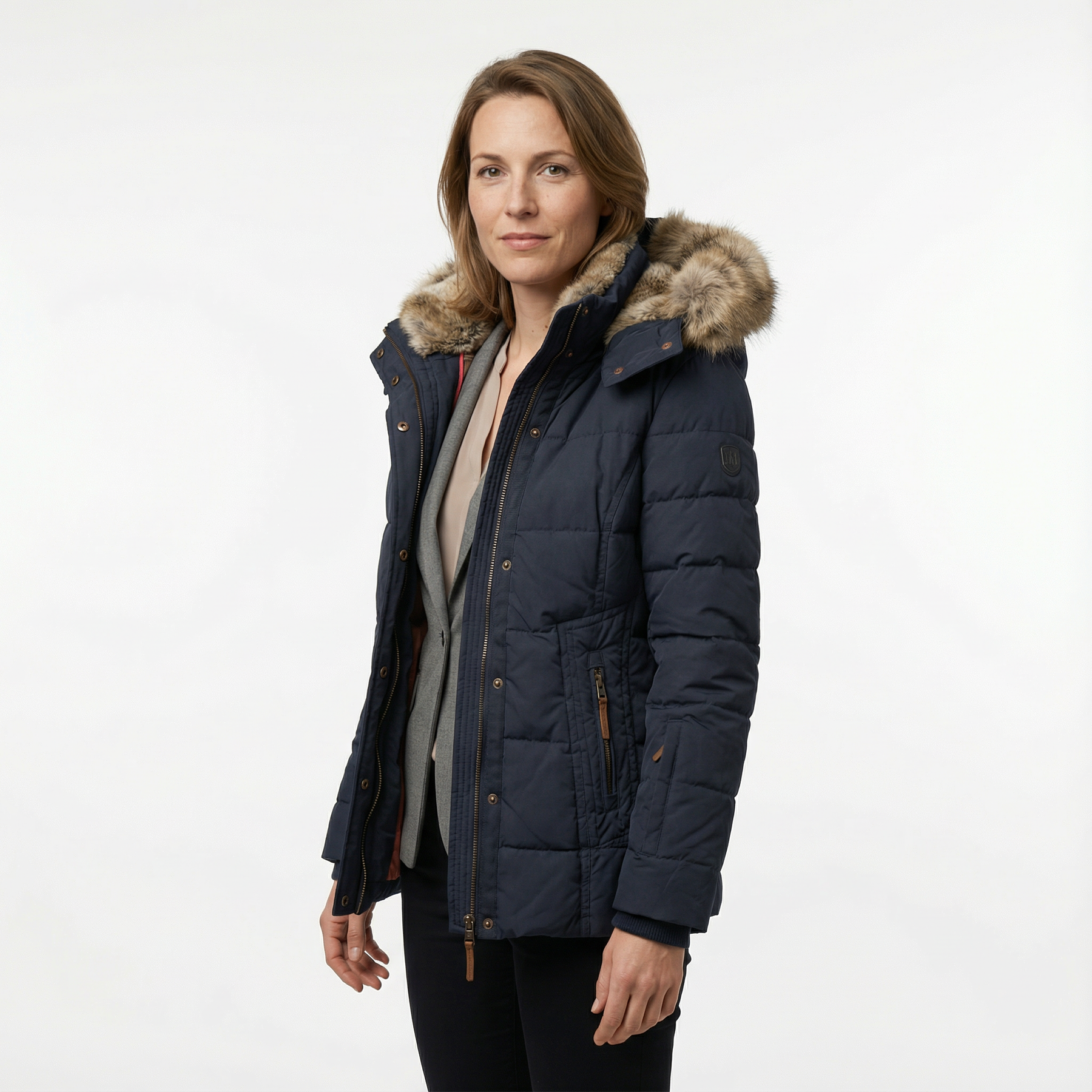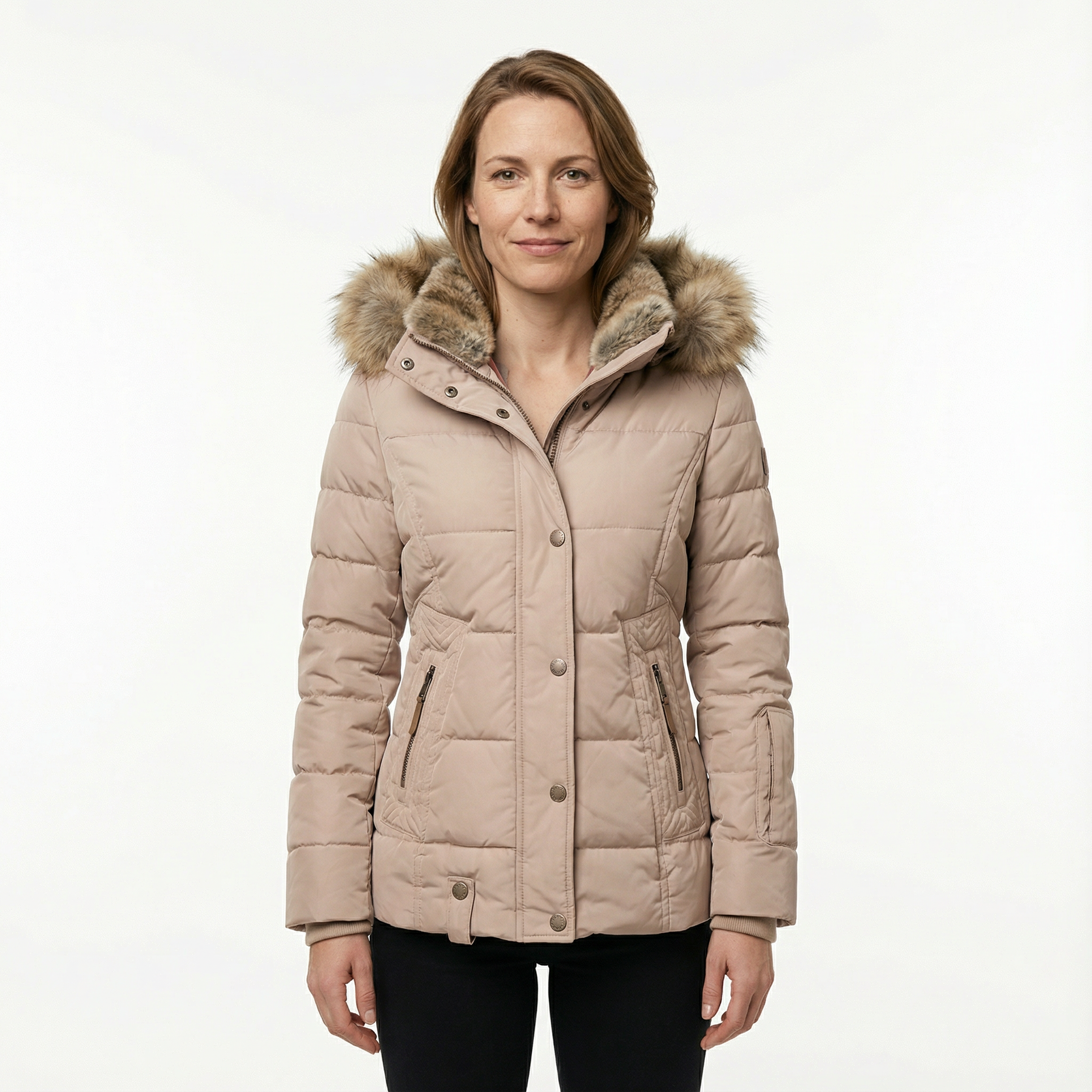 Diese Damen Pufferjacke verbindet modernen Winterstil mit luxuriösem Komfort. Die figurbetonte Silhouette, kombiniert mit einer kuscheligen Kunstfell-Kapuze, macht sie zum idealen Begleiter für kalte Tage in der Stadt oder auf Reisen. Wasserabweisend, isolierend und stilvoll – perfekt für den deutschen Winter.