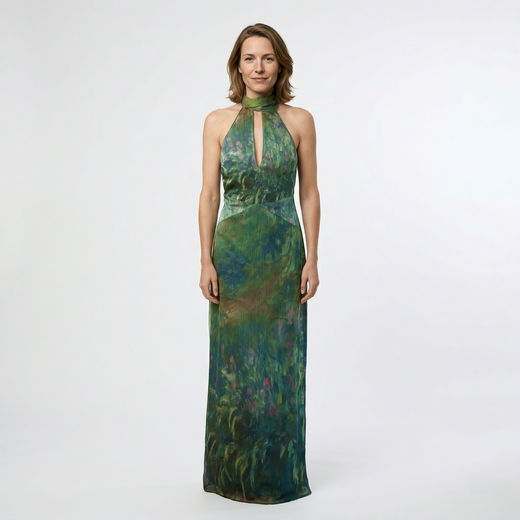 Inspiriert von impressionistischer Schönheit verwandelt dieses Maxikleid Kunst in mühelosen Luxus. Die fließende Silhouette, der edle Ausschnitt und das elegante Rückendetail mit offenem Rücken schaffen einen Look, der zugleich poetisch und modern wirkt – perfekt für Abende, Events und besondere Anlässe, bei denen Eleganz zählt.