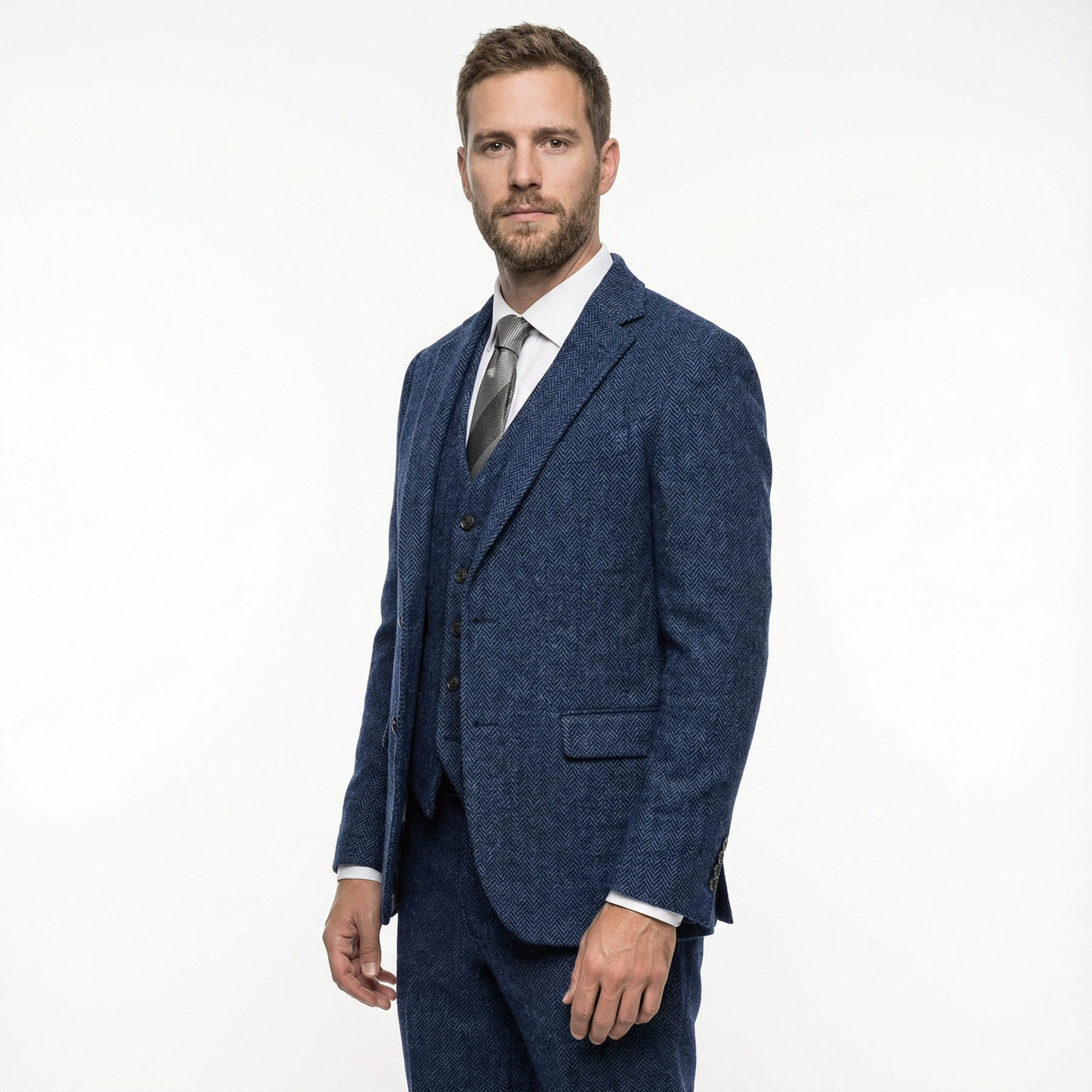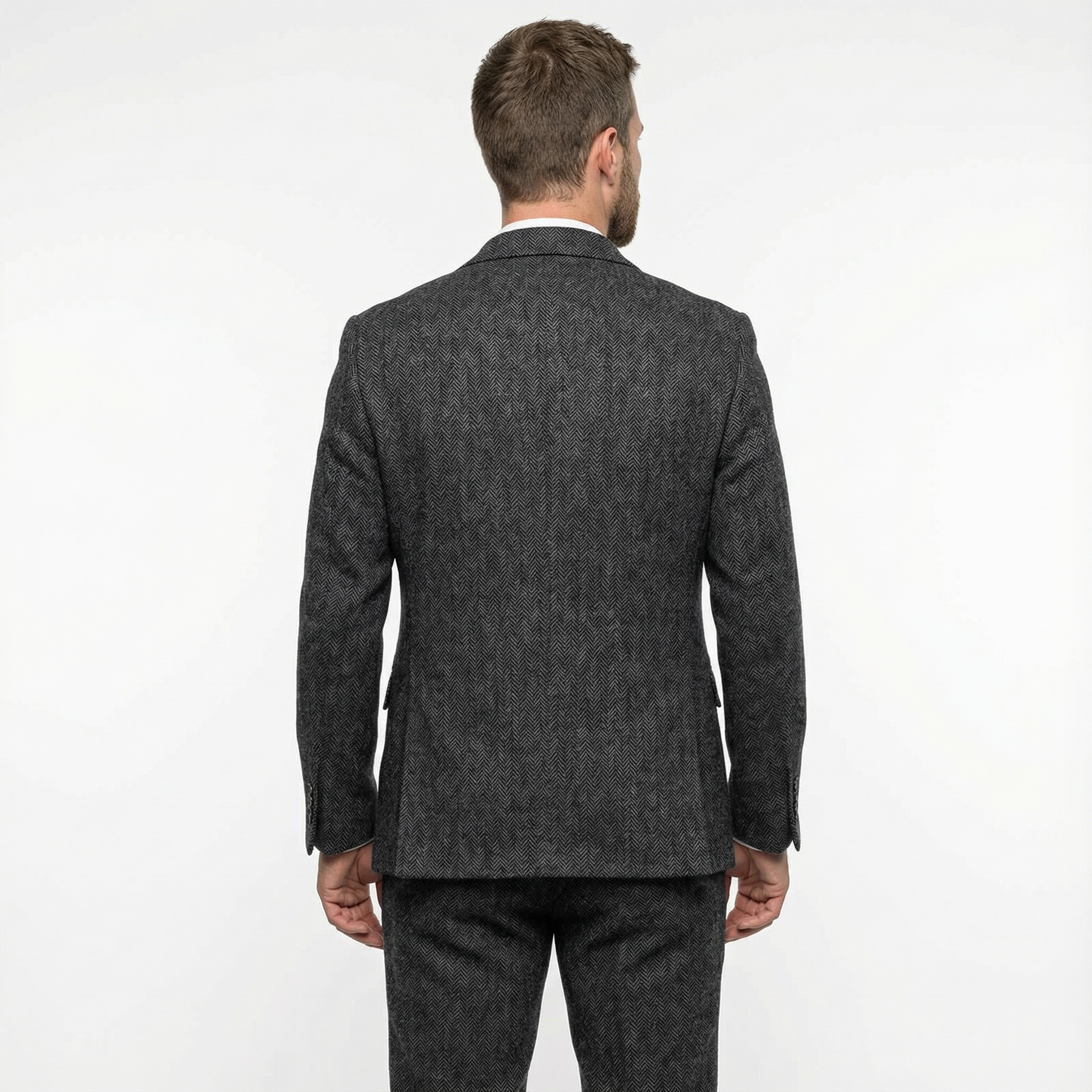 Dieser dreiteilige Woll-Tweed-Anzug vereint klassische Eleganz mit modernem Slim-Fit-Design. Das hochwertige Fischgrät-Muster und der warme Wollstoff machen ihn zur perfekten Wahl für Winterhochzeiten, formelle Anlässe oder stilvolle Auftritte mit Charakter. Ein Anzug für Männer, die Wert auf Stil, Komfort und Qualität legen.