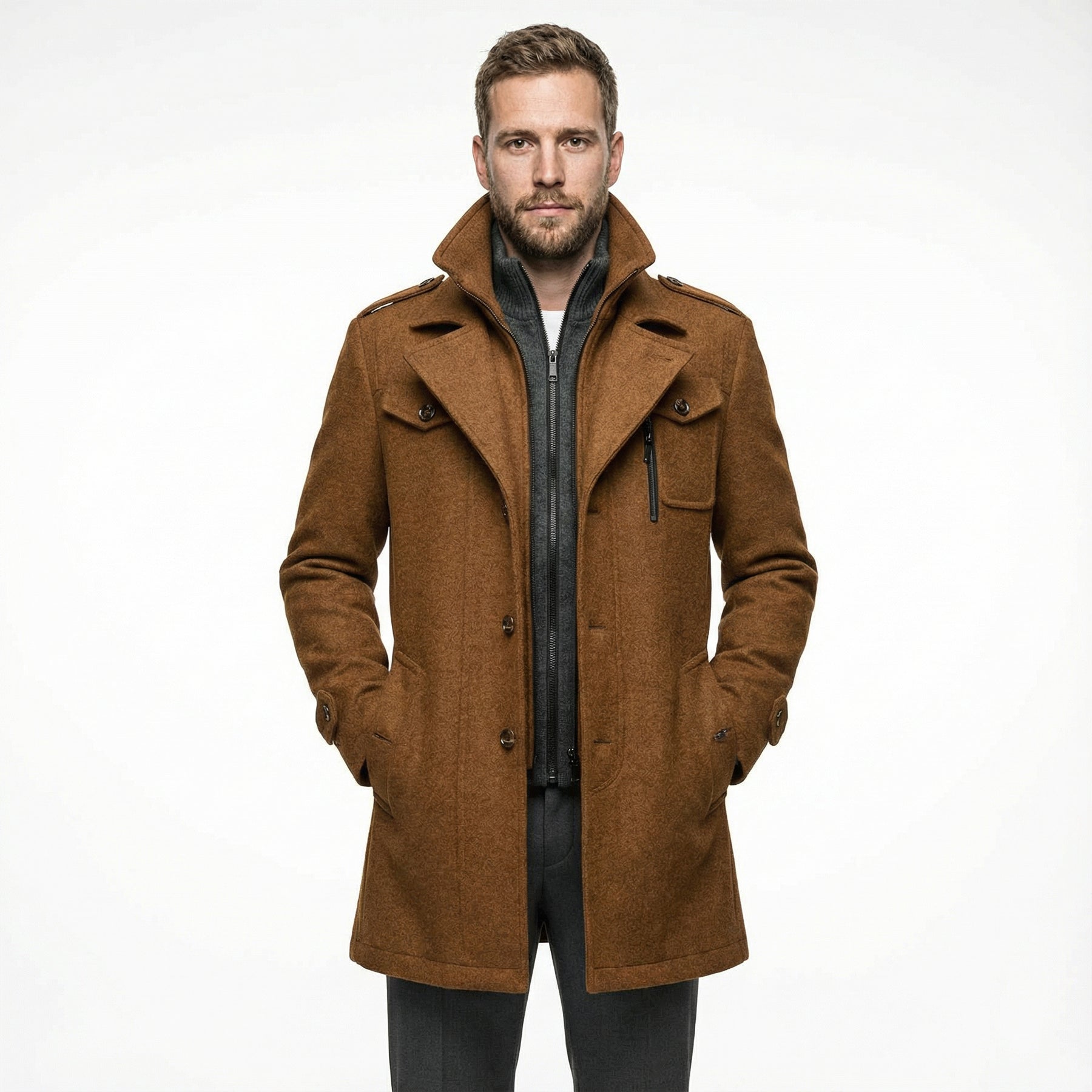 • Maßgeschneiderte Details wie Knöpfe, Schulterriegel und Pattentaschen unterstreichen den eleganten Look