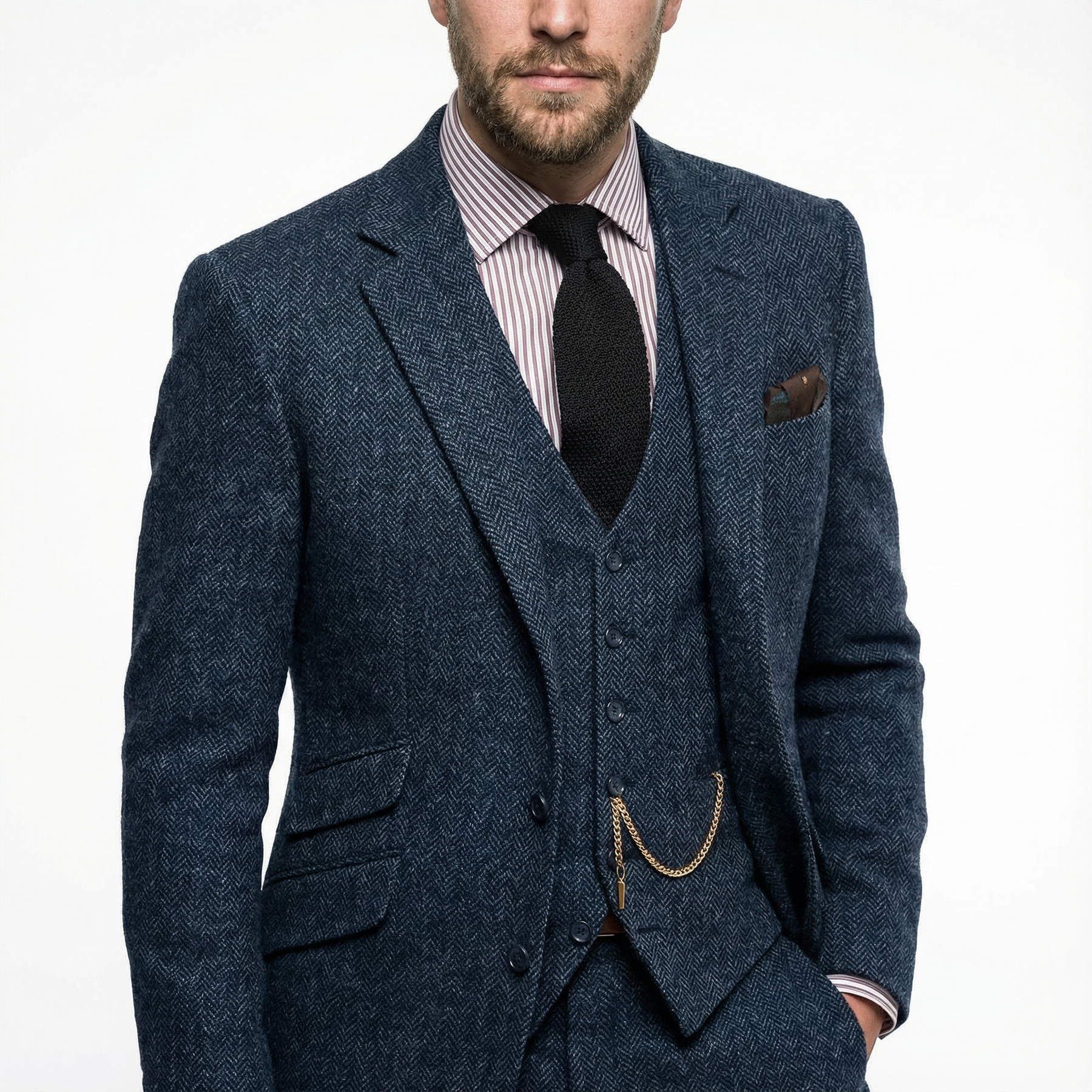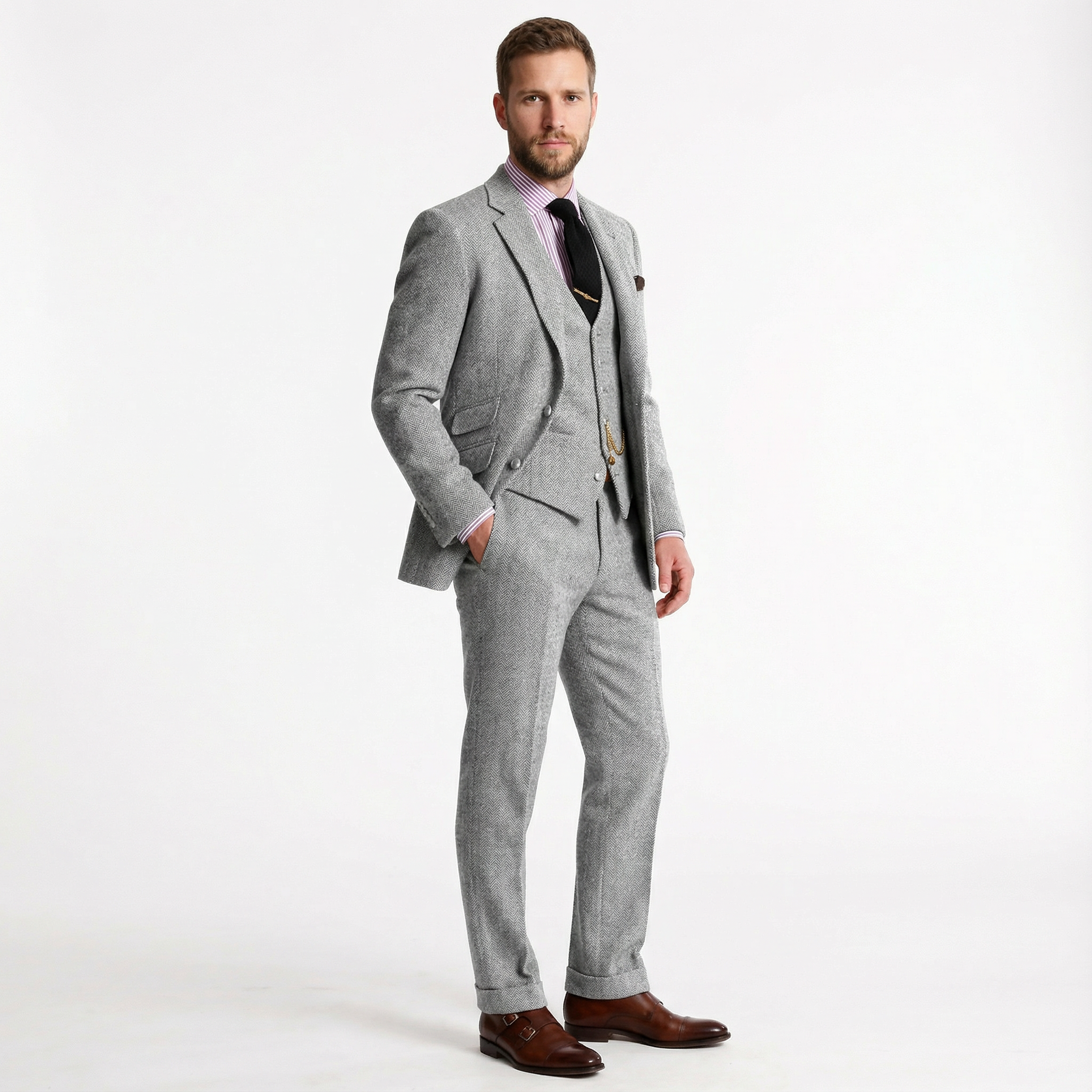 Dieser dreiteilige Herren-Smoking aus Tweed steht für stilvolle Raffinesse und zeitlose Schneiderkunst. Das perfekt abgestimmte Set aus Sakko, Weste und Hose verleiht eine klare, strukturierte Silhouette mit modernem Anspruch. Ideal für Hochzeiten, formelle Events und elegante Abendveranstaltungen.